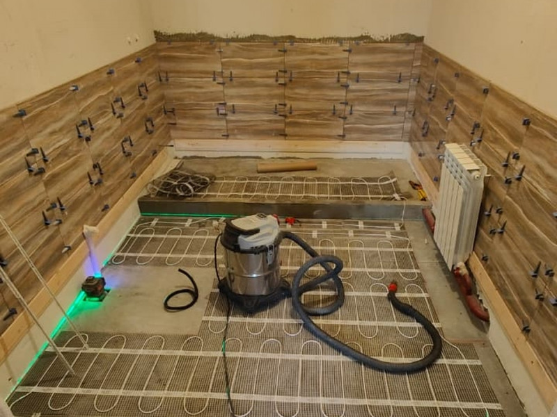 Во второй наш приезд у Натальи снова кипела работа — теперь за дело взялся наш мастер Евгений Меркушин, человек с золотыми руками и безупречной репутацией. Именно он выполнил монтаж в ванной комнате, установив нагревательный мат Russian Heat «RH150» площадью 5,0 м² и мощностью 750 Вт, а также современный терморегулятор RTC 70.26.